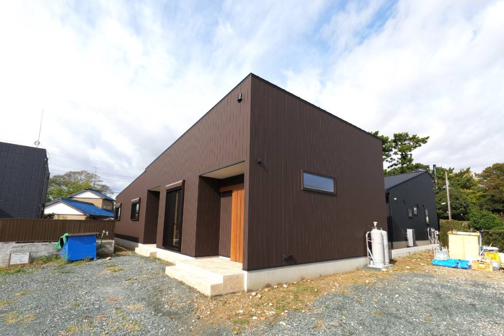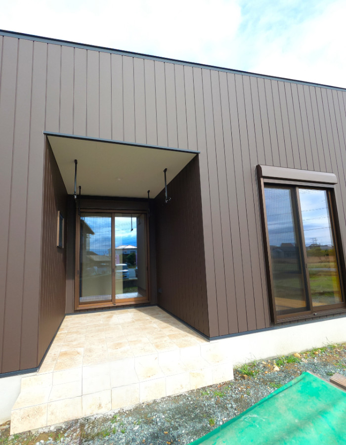仕事でお世話になっているA様のご自宅を新築させていただきました。玄関は、風雨が強い日でも濡れないように入口を内側に凹ませる形に設計しました。
