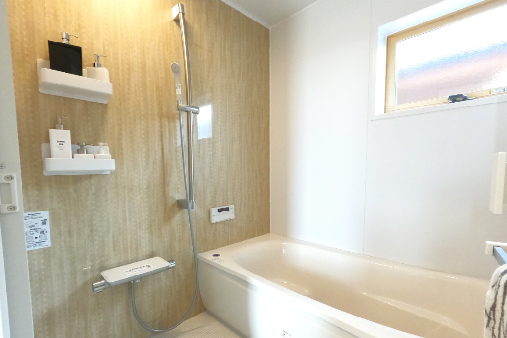 ご家族とゆっくり会話を楽しみながらゆったり入浴できるお風呂です。ご自宅の中央にはタイルデッキを設けました。
