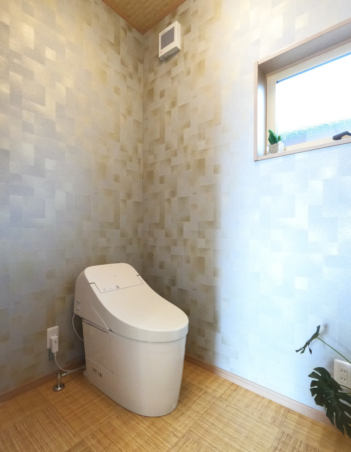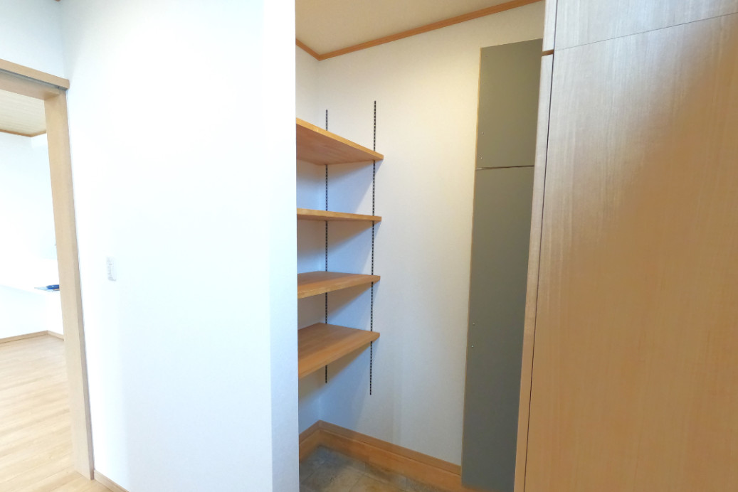 多くの食品を保管することができ、災害用の備えもバッチリです。トイレはガラッと雰囲気を変え籐市松のフロアにし和風テイストに。