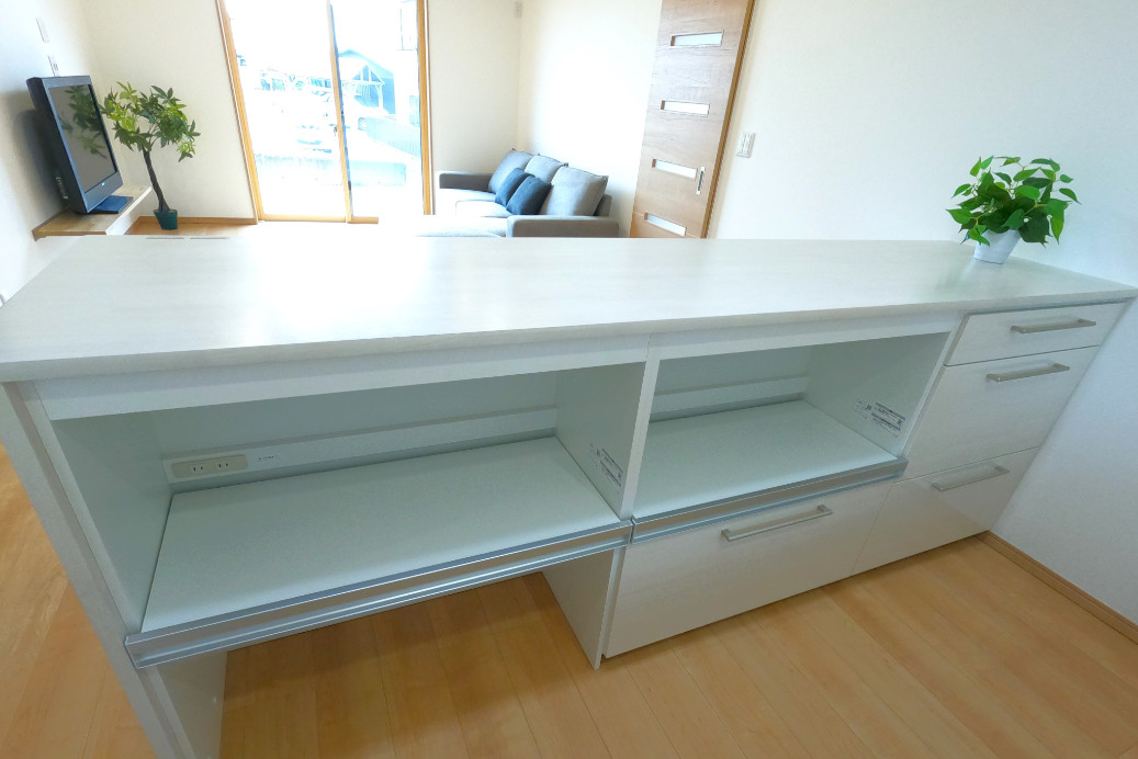 カウンターには棚があり、家電や食器がしまえ、常にカウンターの上はスッキリした状態を保てるので、