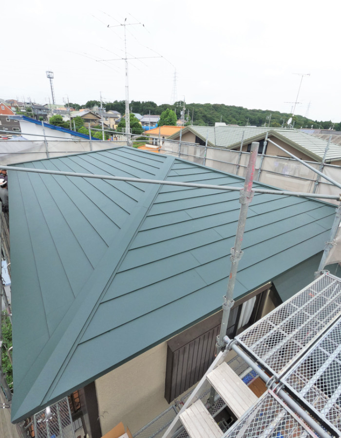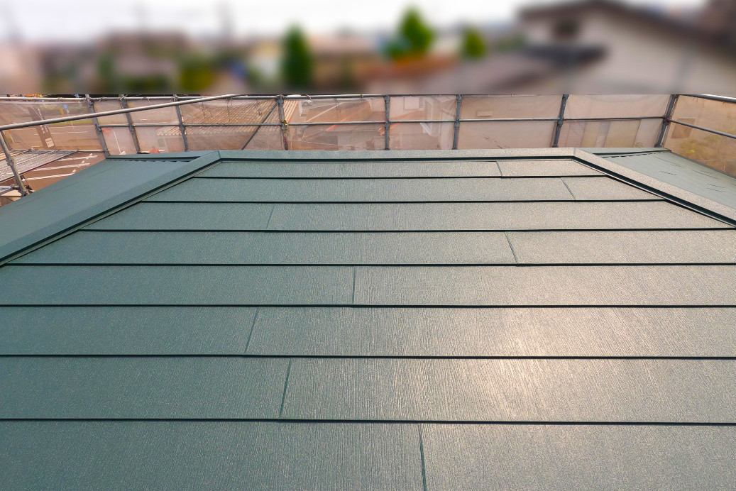 モスグリーンの色合いもお洒落な屋根ですね。